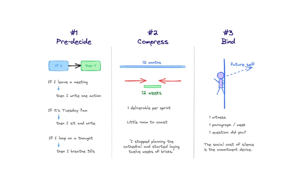 The principle underneath all three: a shorter horizon forces you to choose less and finish more. It also solves another problem I wrote about recently: motivation dies in the middle. When your cycle is twelve weeks instead of twelve months, the middle shrinks from months to days. There’s less space to coast.
